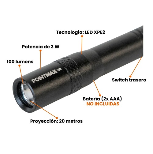 LINTERNA DE BOLSILLO SPINIT POINTMAX 100LM Marca: Spinit Nueva linterna port?til con 100 lumens y clip. Ideal como accesorio de trabajo o m?dica dada su gran portabilidad. Tipo de Linterna: de mano. Potencia m?xima: 100 lumen. Tipo de bater?a: 2x AAA. Tecnolog?a: LED XPE2. Potencia l?mpara: 3 W. Alcance de proyecci?n: 20 m. Enfoque: No Grado de aislaci?n: IPX4. Modos de iluminaci?n: ONOFF. Encendido: Switch trasero. No incluye bater?a ni conexi?n USB. Medidas: Alto 139 mm Di?metro 15 mm. Peso 24 g. Garant?a: 6 Meses. Origen: China.