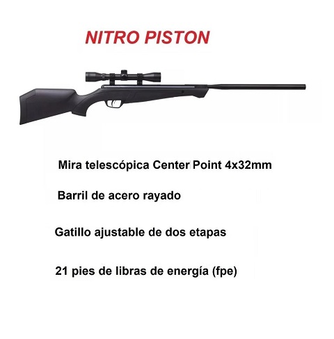 Marca: Crosman Modelo: Crusher NP Calibre: 5.5 mm (.22) Fuente de Potencia: NitrPistón Sistema de disparo: Monotiro por quiebre de cañón Potencia: 950 FPS (alloy pellets) // 800 FPS (regular pellets) Peso: 2,720 kg. Largo total: 120 cm. Tipo de caño: Microestriado Material del caño: Acero Tipo de culata: Montecarlo Material de la culata: Polímero Origen: China Alcance efectivo: 40 – 50 metros Mira abierta de fibra óptica Riel para colocación de mira telescópica Seguro de gatillo Gatillo regulable de dos etapas Cantonera de goma antichoque